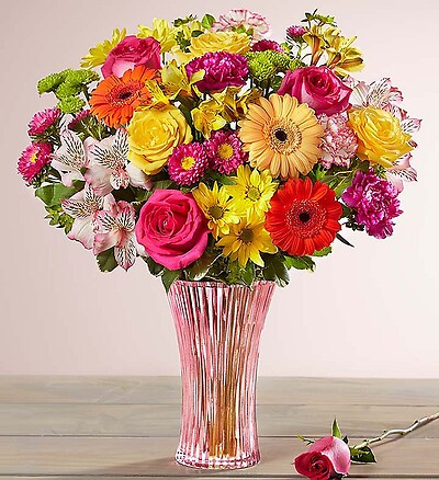 This bold, colorful bouquet of roses, mini Gerbera daisies, Peruvian lilies, daisy poms, carnations and more pops from our vintage-inspired pink vase—reminiscent of Depression era glass—which highlights the brilliance of each and every bloom. We can’t think of a more festive way to celebrate someone special.